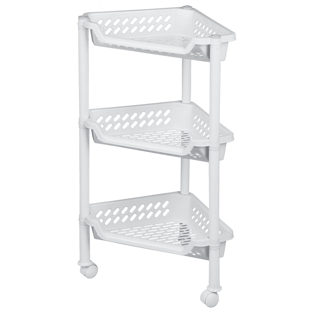 Il ripiano angolare con 3 ripiani in plastica bianca si inserisce perfettamente nell'angolo della stanza