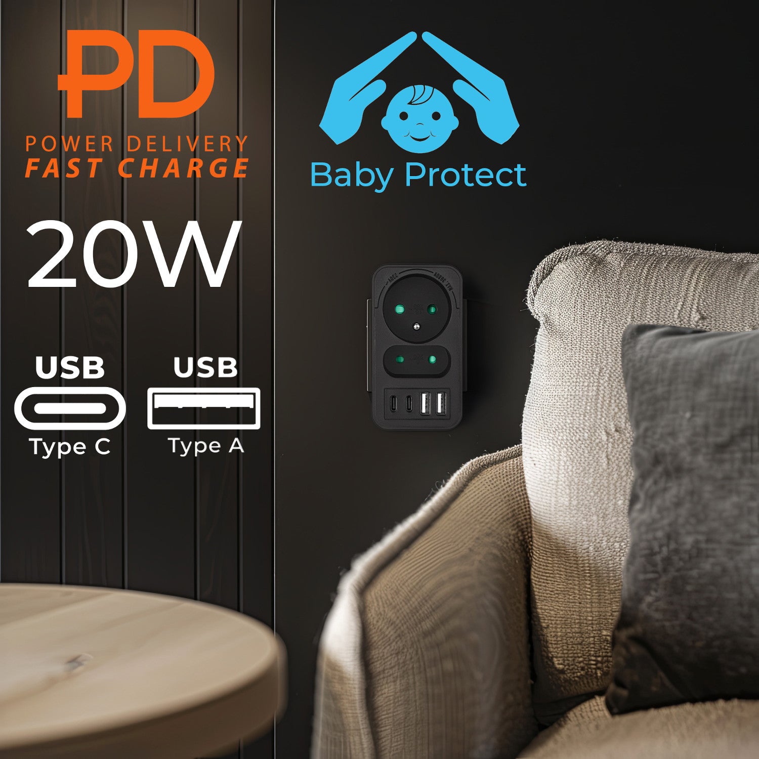 Le due porte USB di tipo A integrate con capacità fino a 3A (max. 18 W) sono perfette per ricaricare accessori come cuffie wireless, powerbank, altoparlanti Bluetooth o bracciali sportivi. Le due porte USB di tipo C con tecnologia Power Delivery (max. 20 W) assicurano una ricarica rapida e stabile dei dispositivi moderni: smartphone, tablet, console portatili e altri dispositivi che supportano lo standard Power Delivery. Grazie a questa combinazione, è possibile alimentare contemporaneamente più dispositivi con requisiti energetici diversi, senza dover ricorrere a caricabatterie aggiuntivi.
