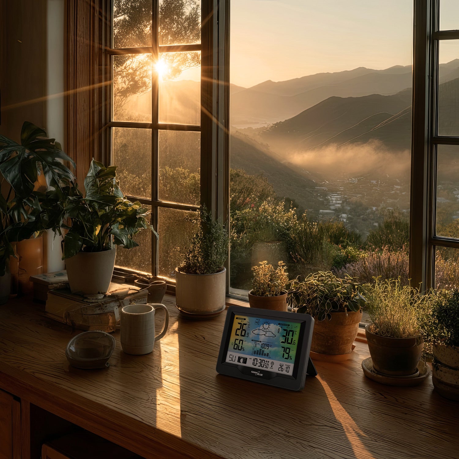 La stazione meteorologica GreenBlue GB540N è un dispositivo all'avanguardia che consente di monitorare le condizioni meteorologiche sia all'interno che all'esterno. È dotata di un ampio display a colori, sistema DCF per la sincronizzazione automatica dell'ora, barometro, calendario e funzione di visualizzazione delle fasi lunari. Grazie a un sensore esterno wireless, la stazione può misurare la temperatura e l'umidità esterna a una distanza massima di 60 metri.