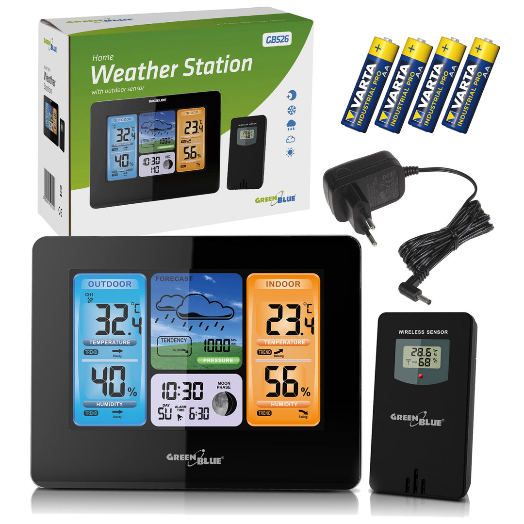 Stazione meteorologica wireless GreenBlue, a colori, con DCF, fasi lunari, alimentatore, batterie, GB526