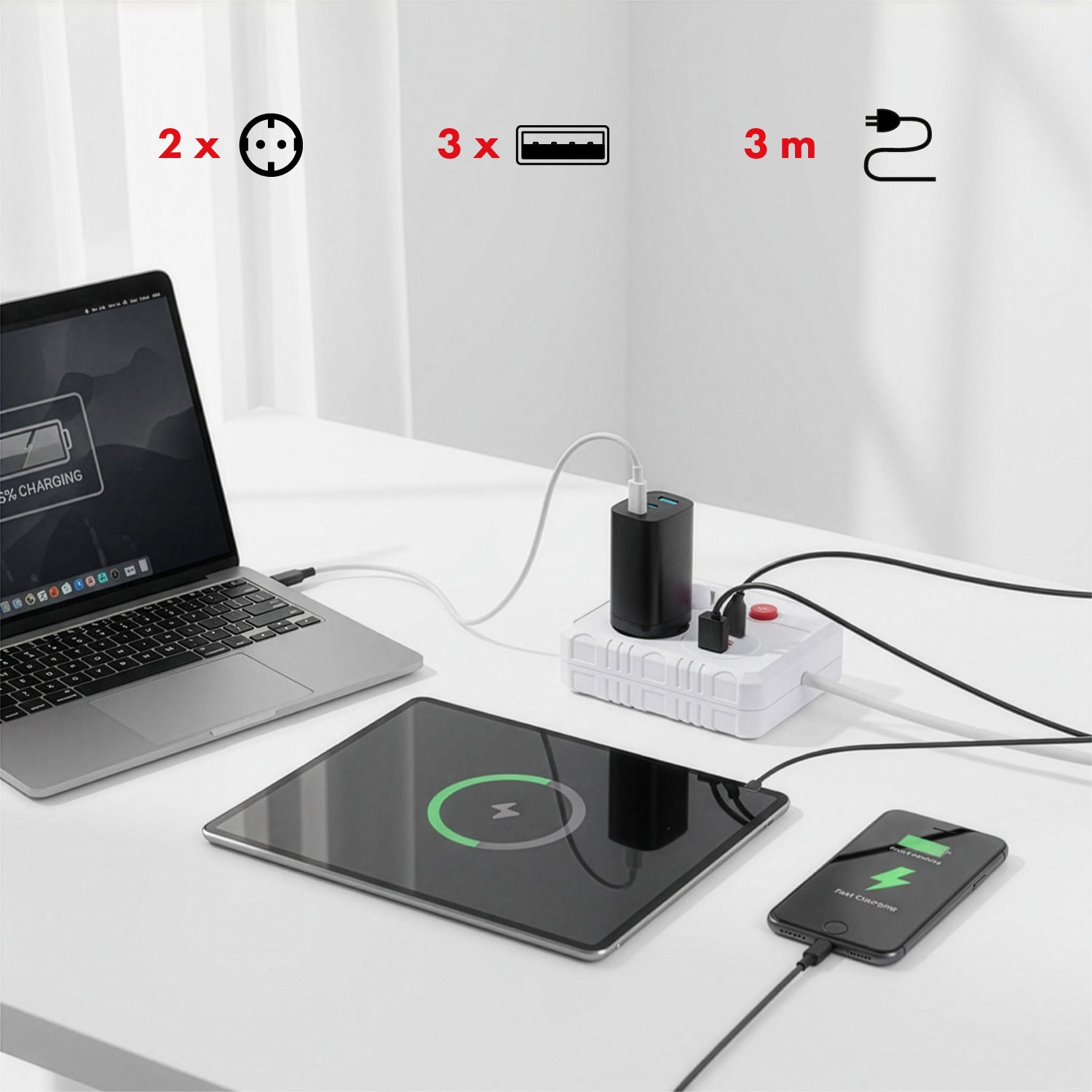 La moderna ciabatta elettrica con 2 prese e 3 porte USB è la soluzione ideale per chi ha bisogno di una ciabatta piccola ma funzionale per l'ufficio, il soggiorno o la camera da letto. Grazie alla potenza di 2500W e al design robusto, fornisce un'alimentazione sicura per i dispositivi essenziali, occupando pochissimo spazio. È una scelta eccellente quando l'ordine, la praticità e il design moderno sono importanti.