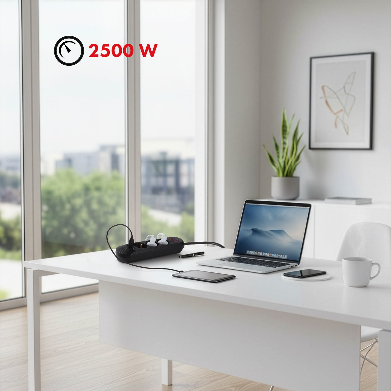La ciabatta elettrica con 3 prese di corrente e 3 porte USB è la soluzione ideale per chi ha bisogno di un modo compatto ma funzionale per alimentare diversi dispositivi contemporaneamente. Con una potenza massima di 2.500 W e un design robusto, è perfetta per l'uso alla scrivania, in camera da letto o in salotto. È un modo affidabile per organizzare i cavi e ricaricare comodamente le apparecchiature mobili senza adattatori aggiuntivi.