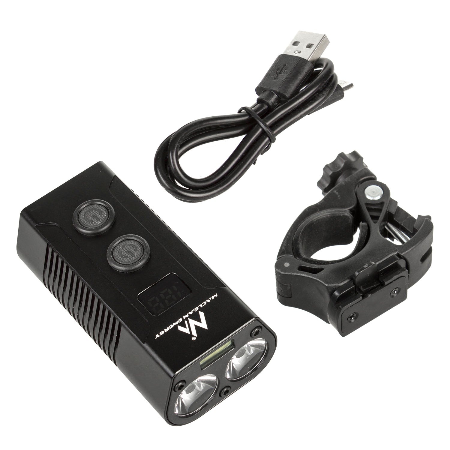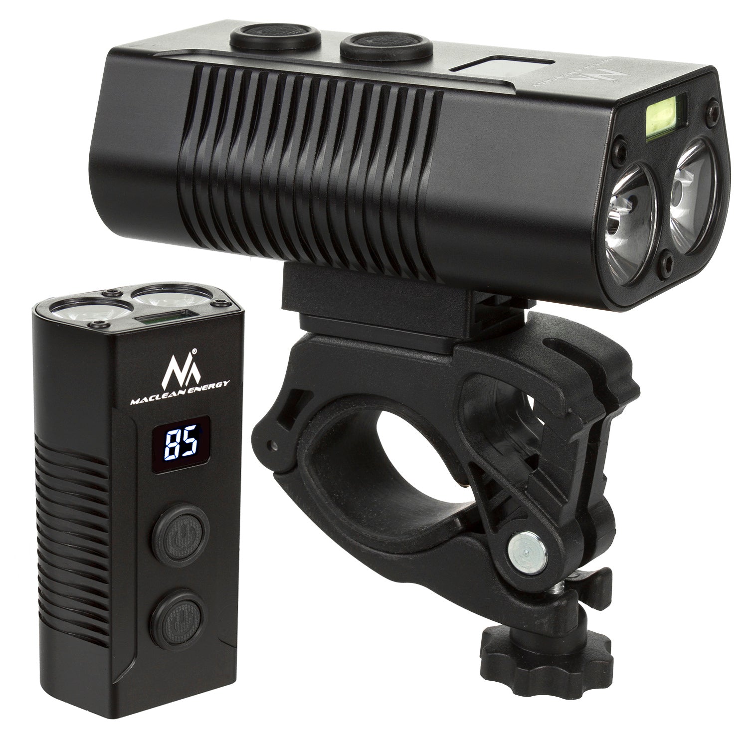 Torcia per biciclette di alta qualità con power bank della rinomata azienda Maclean Energy Semplice da usare, facile da usare, dotata di sorgenti luminose molto potenti: 2 LED Cree XML e un LED COB.