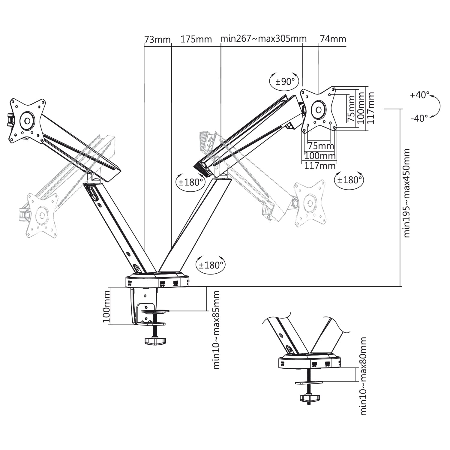 RS887 di NanoRS è un versatile supporto da tavolo per doppio monitor che è stato adattato alle esigenze dei giocatori di computer. Ergonomia, forza innovativa e comfort: queste sono le migliori condizioni per un gioco per computer preciso, indisturbato e, soprattutto, piacevole, che ti viene offerto qui. Questa staffa è adatta per un massimo di due schermi da 17 "a 32" pollici con un peso massimo di fino a 8 kg per braccio di sostegno.
