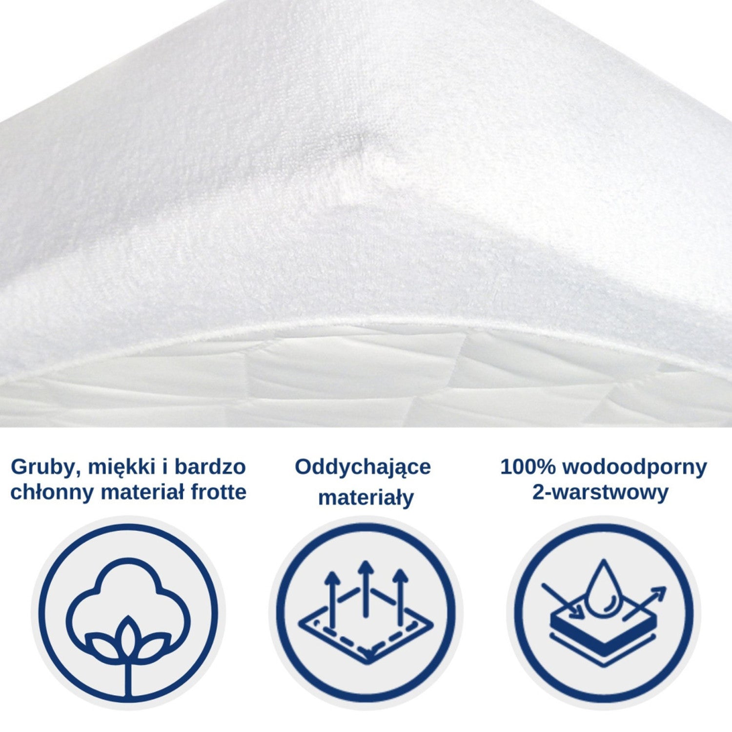 Lo strato superiore del lenzuolo è realizzato in cotone spesso, morbido e altamente assorbente, mentre la parte interna, che protegge la parte superiore del materasso, è realizzata in membrana TPU traspirante e impermeabile. Il TPU è una versione migliorata del PU, che protegge completamente il materasso dall'annidamento di batteri, microbi e acari della polvere. La membrana traspirante in TPU permette all'umidità e al calore corporeo di fuoriuscire, mantenendo una corretta circolazione dell'aria. Il materiale morbido e non frusciante garantisce un ambiente di sonno e riposo confortevole.