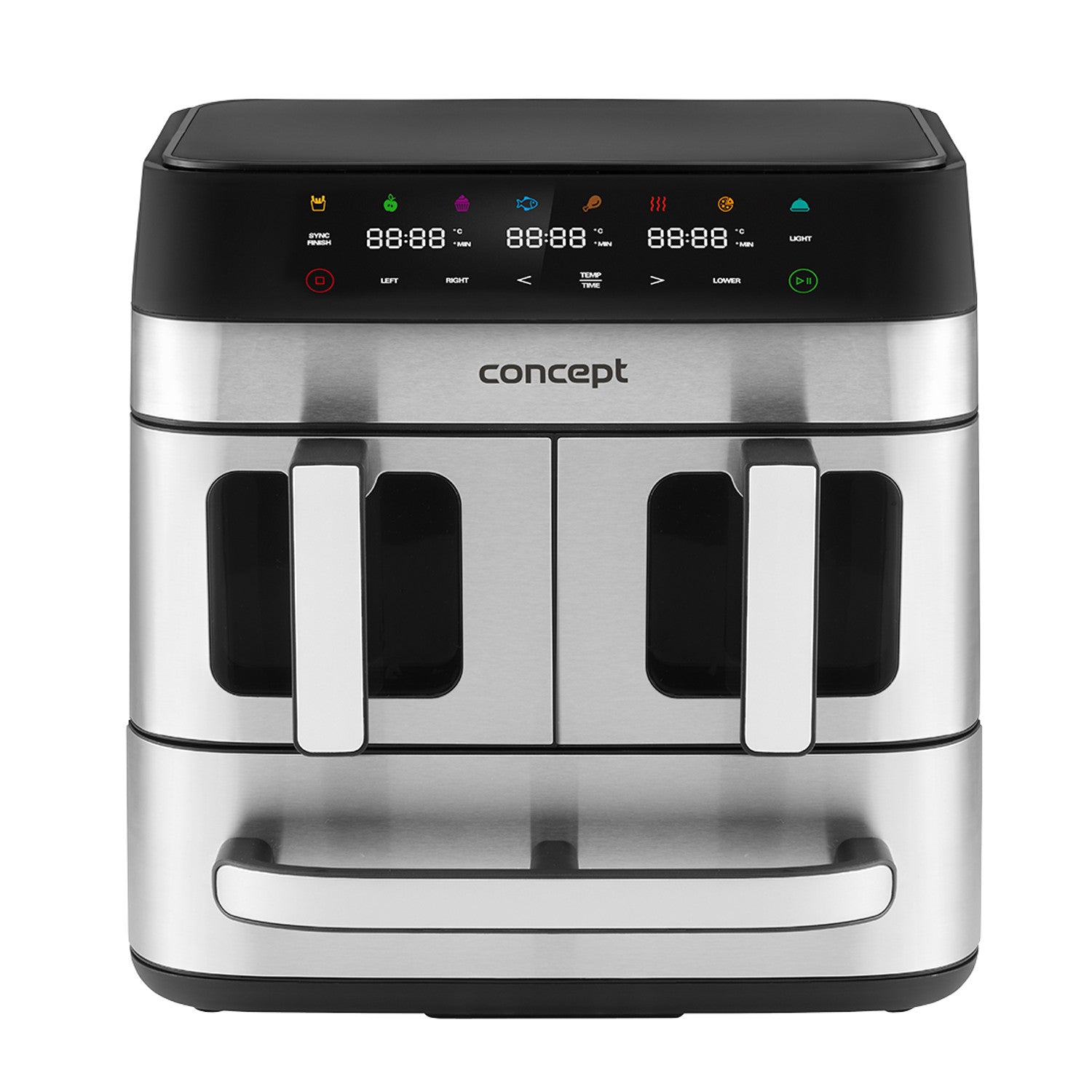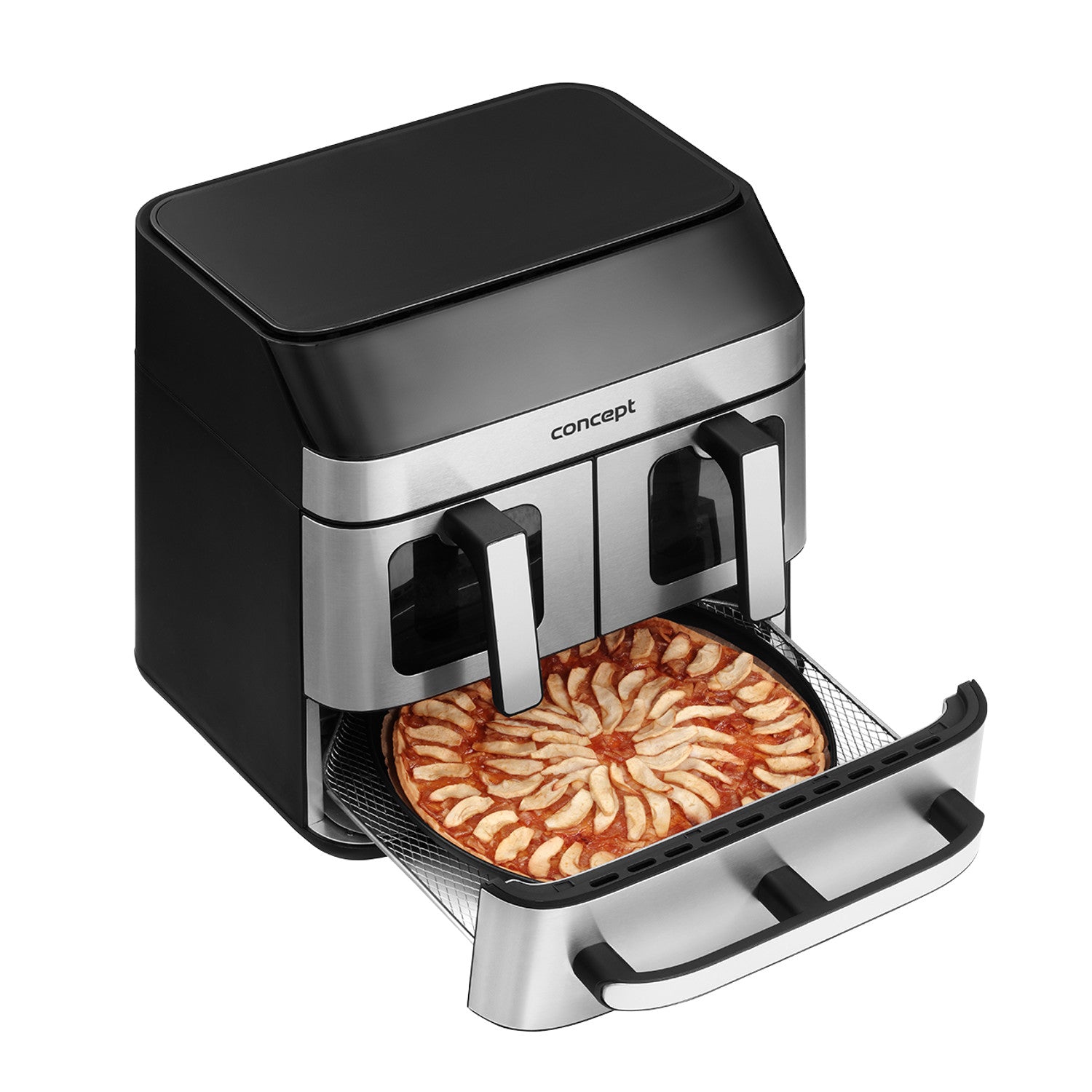 Con la friggitrice senza grassi PIZZA TRIO Concept FR9000 da 18,5 l, dotata di due cestelli indipendenti e di un cassetto di cottura multifunzionale, preparerete un menu completo in una sola volta. Mentre preparate un piatto principale e un contorno nei cestelli della friggitrice, cuocete una torta per il caffè pomeridiano nel cassetto multifunzionale. Questa è la nuova generazione di cucina: veloce, gustosa, efficiente e senza compromessi.