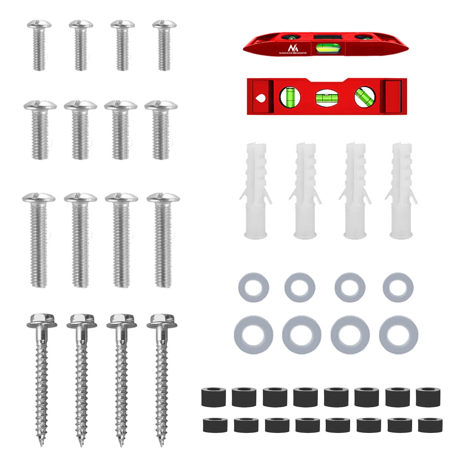 Possiamo facilmente fissare al supporto uno schermo standard VESA: 100x100, 200x100, 200x200, 200x300, 300x200, 300x300, 300x400, 400x200, 400x400 mm. Il set include un livello che facilita l'installazione precisa e un set di viti di montaggio, che rendono l'installazione semplice e senza problemi.