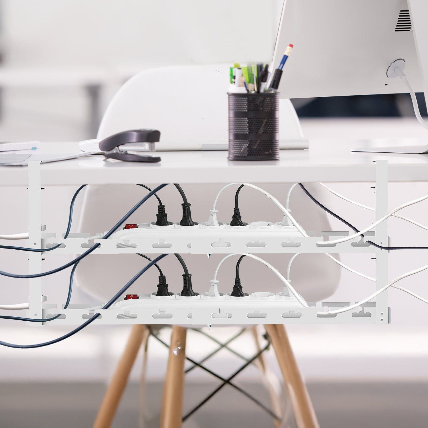L'organizzatore di cavi a due livelli montato sotto la scrivania è la soluzione ideale per chi ha bisogno di più spazio per organizzare cavi e apparecchiature elettriche. Con una lunghezza regolabile da 433 a 728 mm, è possibile adattarlo facilmente a scrivanie di dimensioni e lunghezze diverse. I due livelli di staffe consentono di montare contemporaneamente due ciabatte o dispositivi aggiuntivi come alimentatori, hub USB o router. Il sistema di montaggio a morsetto rende l'installazione rapida e non invasiva: non è necessario forare o disturbare la superficie del mobile.