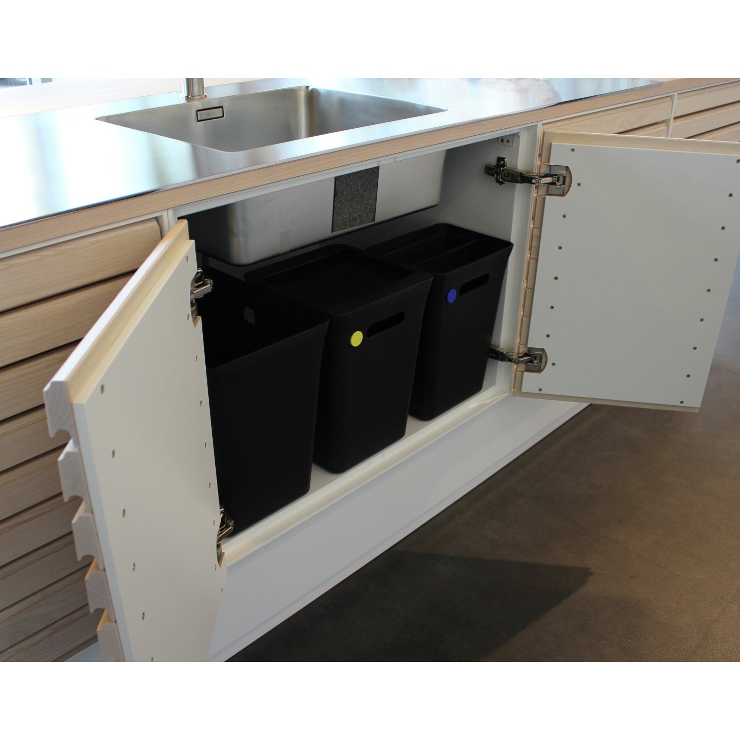 Cestino della moderna serie Avedøre per la gestione dei rifiuti. Comoda maniglia per il trasporto del cestino. Sulla parete anteriore del cestino piccoli fori per mettere una spilla colorata - il suo colore indica il tipo di rifiuti da mettere nel cestino.