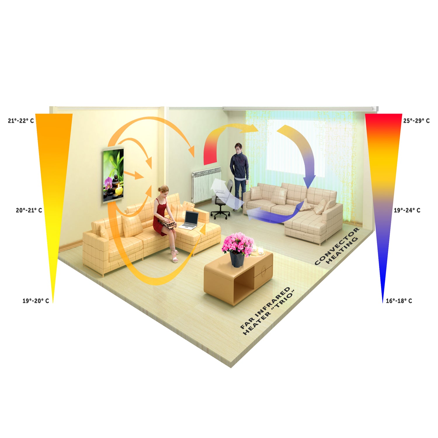 Il riscaldatore fornisce il calore e comfort termico nella stanza. L'effetto si ottiene grazie alle lunghe onde infrarosse che si generano quando la fibra di carbonio viene riscaldata. La fibra di carbonio ha un'elevata conduttività termica, che consente di ridurre il consumo di energia e quindi risparmiare sul riscaldamento