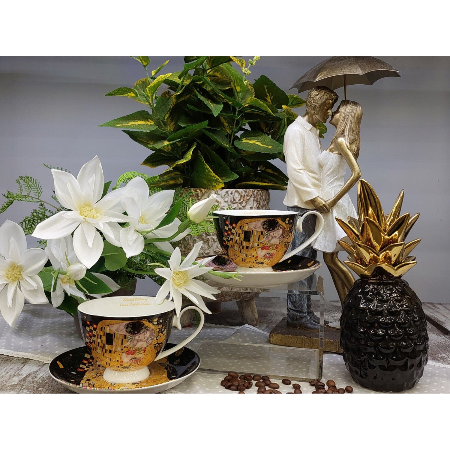 Immaginate di bere il caffè del mattino o il tè della sera da una tazza decorata con uno dei dipinti più famosi della storia dell'arte: "Il bacio" di Gustav Klimt. Questa non è una normale porcellana: è una piccola opera d'arte nelle vostre mani, che ogni giorno vi ricorda la bellezza, l'eleganza e i momenti speciali.